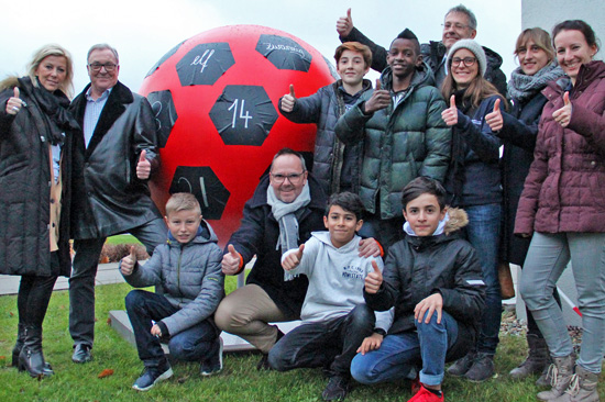 Jugendliche aus verschiedenen Nationen im Alter von 11 bis 14 Jahren gestalteten anlässlich des 15-jährigen Jubiläums von Anpfiff ins Leben e.V. den überdimensionalen Fußball mit selbst aufgenommenen und digital bearbeiteten Fotomotiven aus Ludwigshafen, die im Rahmen eines von der Spedition Alpensped finanzierten Herbstferien-Workshops entstanden waren.