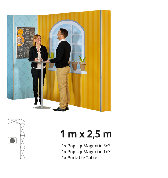 Erstellen Sie mit dem Pop Up Magnetic einen flexiblen und kosteneffizienten Messestand in variabler Größe. Verwenden Sie die gleichen Grafiken und kombinieren Sie die Module individuell für Ihre gewünschte Standfläche.